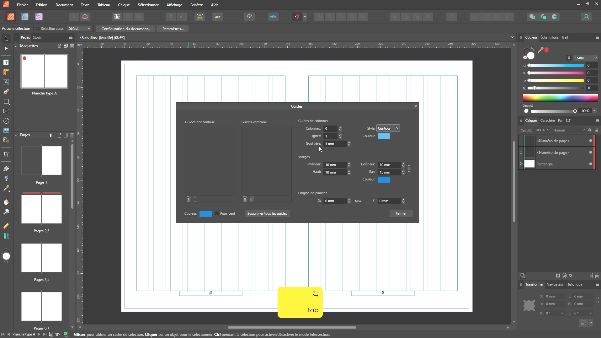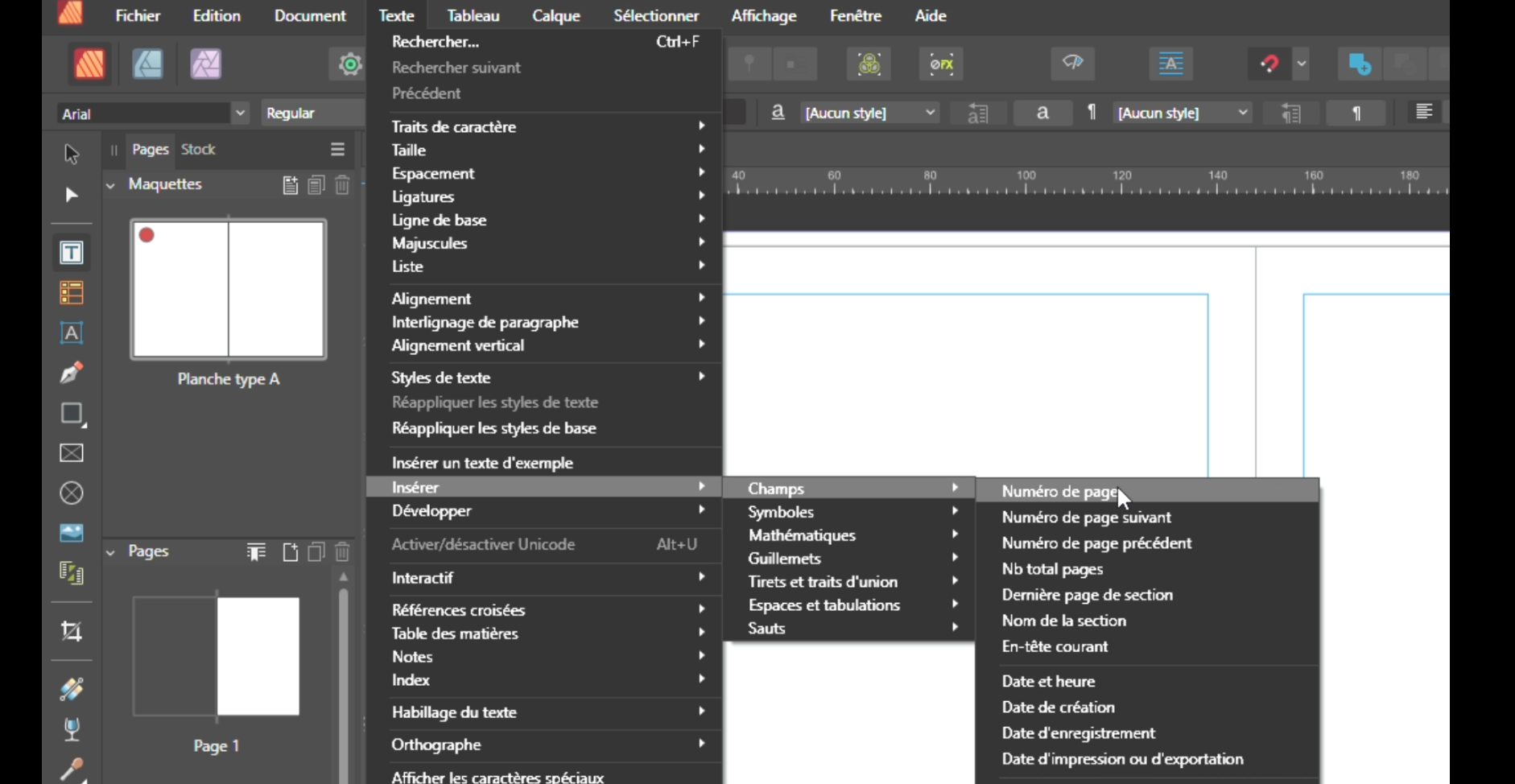 Ajouter des éléments à votre maquette comme un fond (outil Rectangle) ou des champs automatiques (ex. : numéro de page via Texte > Insérer champ > Numéro de page)