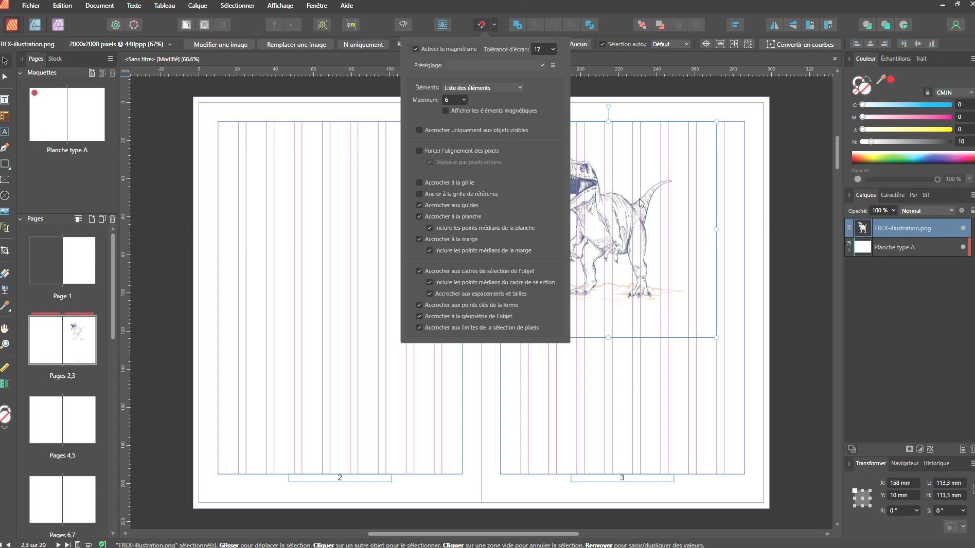 Lorsque vous placez des éléments dans la mise en page (images, formes, blocs de texte), je vous recommande d'activer le système de magnétisme. Ce système affiche des repères verticaux dynamiques, verts et rouges pour les repères horizontaux. Ils vous aident à aligner parfaitement vos éléments entre eux ou par rapport à la grille.
