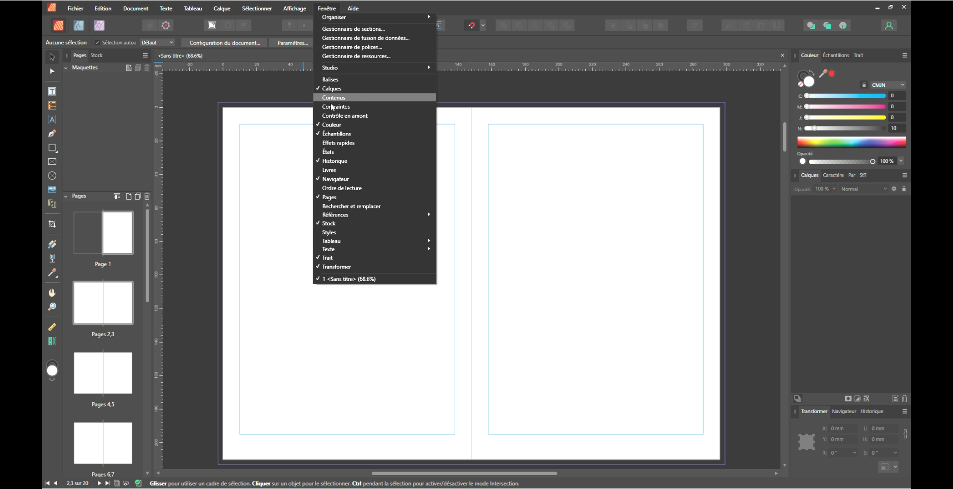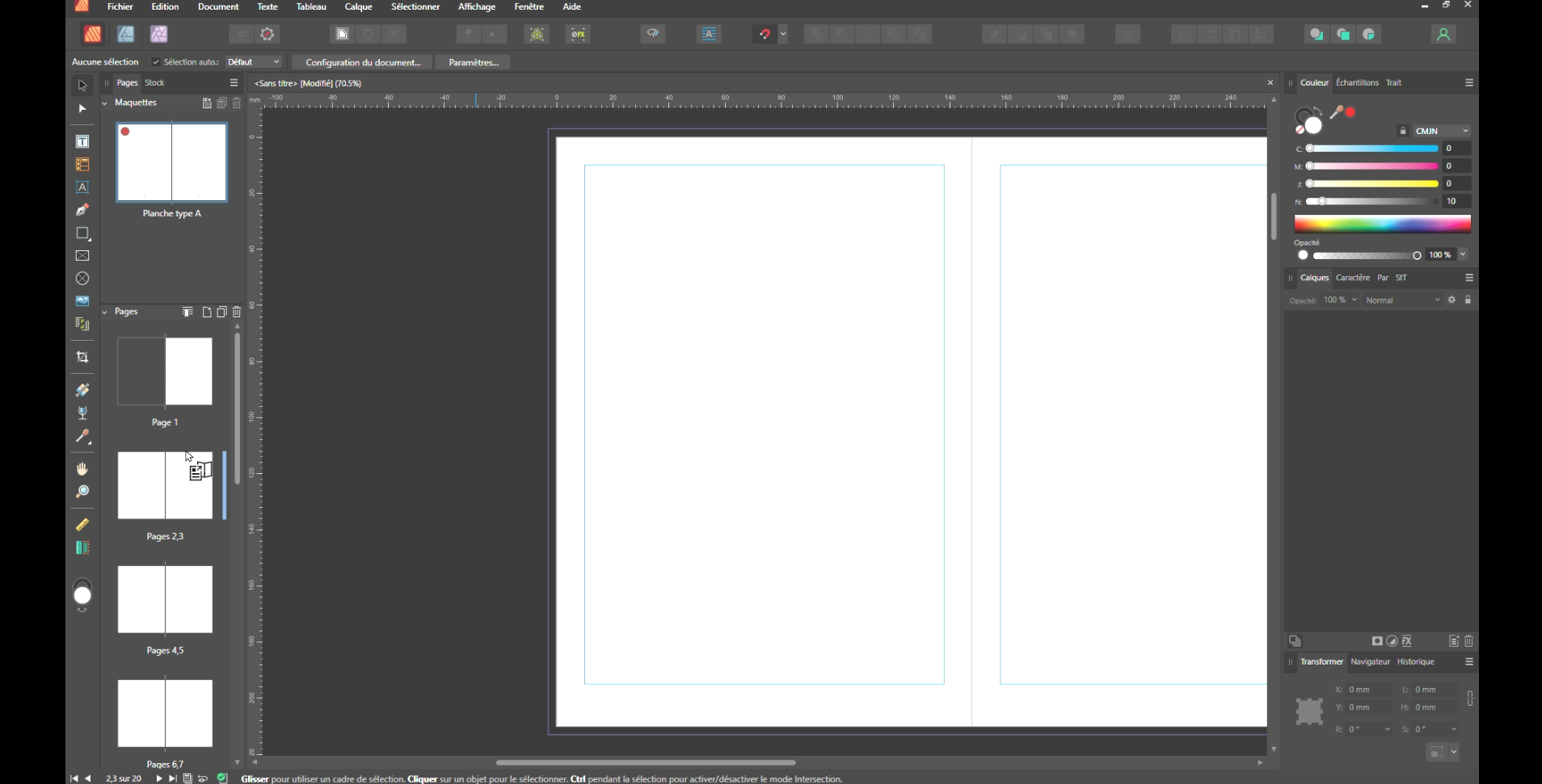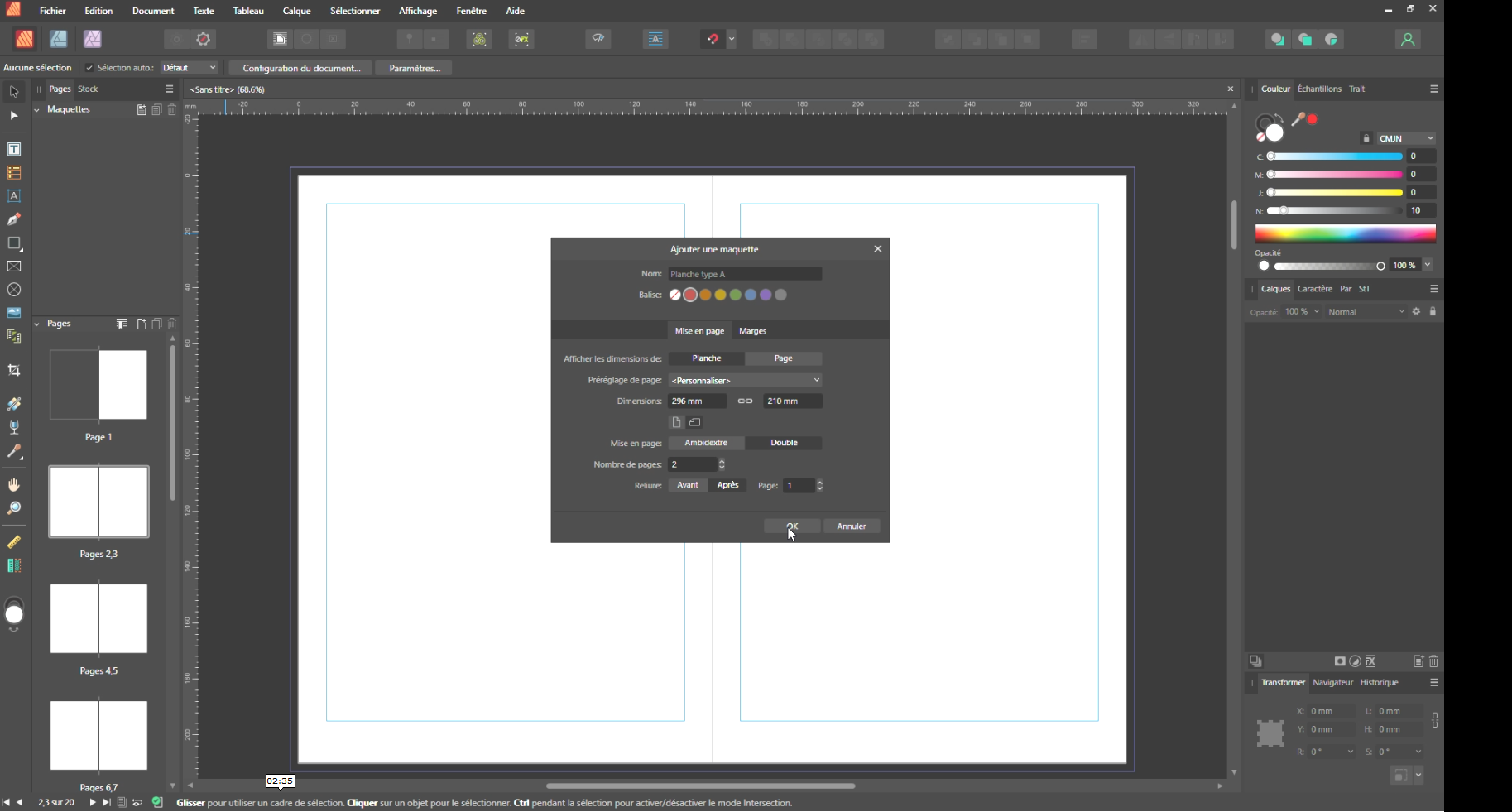 L’onglet « Mise en page » permet de gérer les dimensions, tandis que l’onglet « Pages » permet de définir leur nombre et disposition. Le fond perdu est laissé par défaut à 3 mm ou 3,5 mm, ce qui est idéal pour les impressions professionnelles.