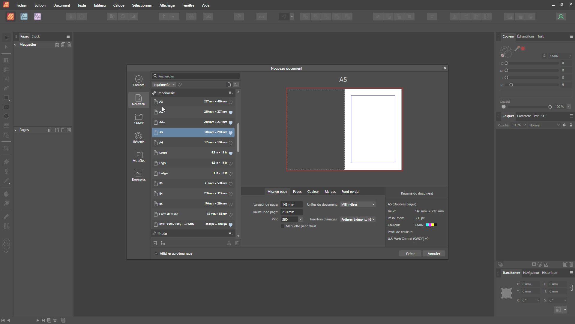 La première étape consiste à créer un nouveau document via le menu Fichier > Nouveau. Vous accédez alors à une interface de configuration où vous pouvez :