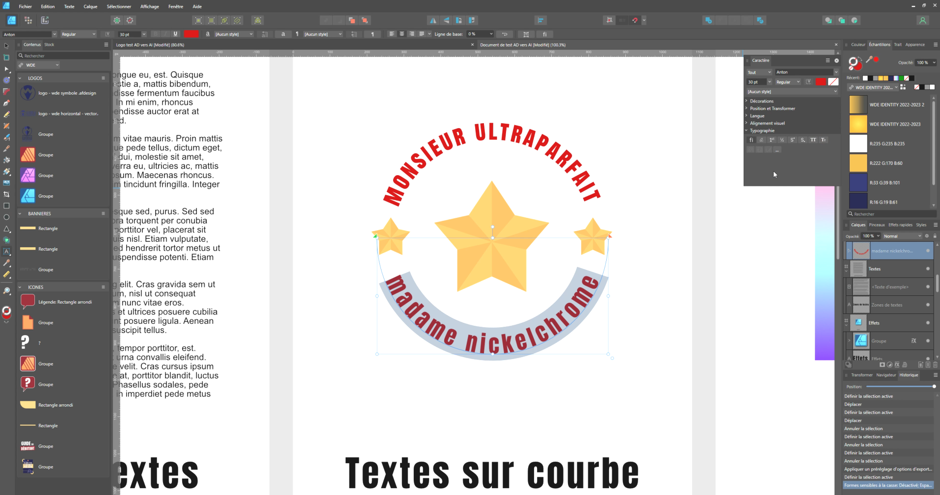 Dans l'exemple du tutoriel, un texte est placé sur un tracé circulaire et stylisé à l'aide de l’option "petites capitales" dans le panneau de caractère d’Affinity Designer.