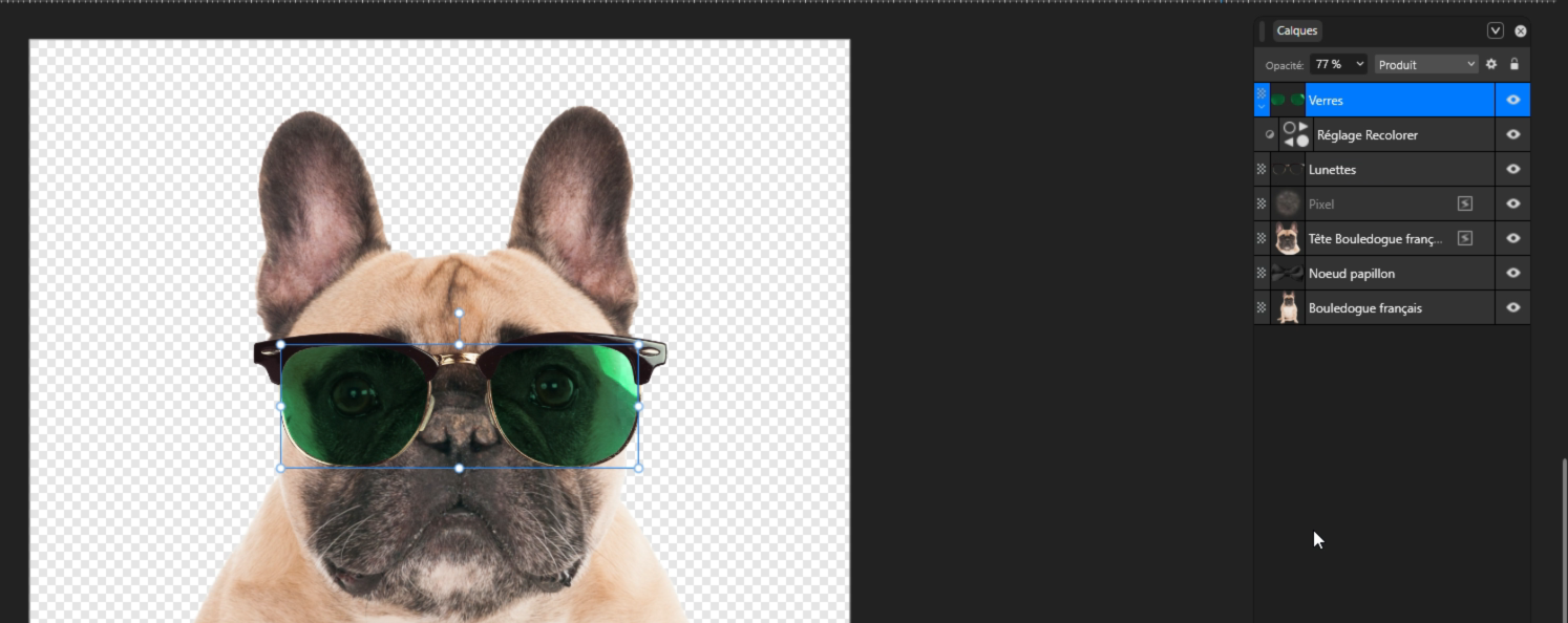 Puis jouer sur l’opacité et le mode de fusion, comme produit du calque qui accueil le réglage (verres), pour donner plus de réalisme.