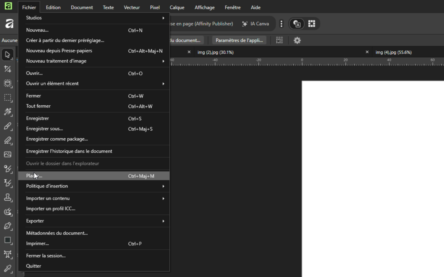 Ensuite, on va importer des photos : faites Fichier > placer et sélectionnez vos photos.