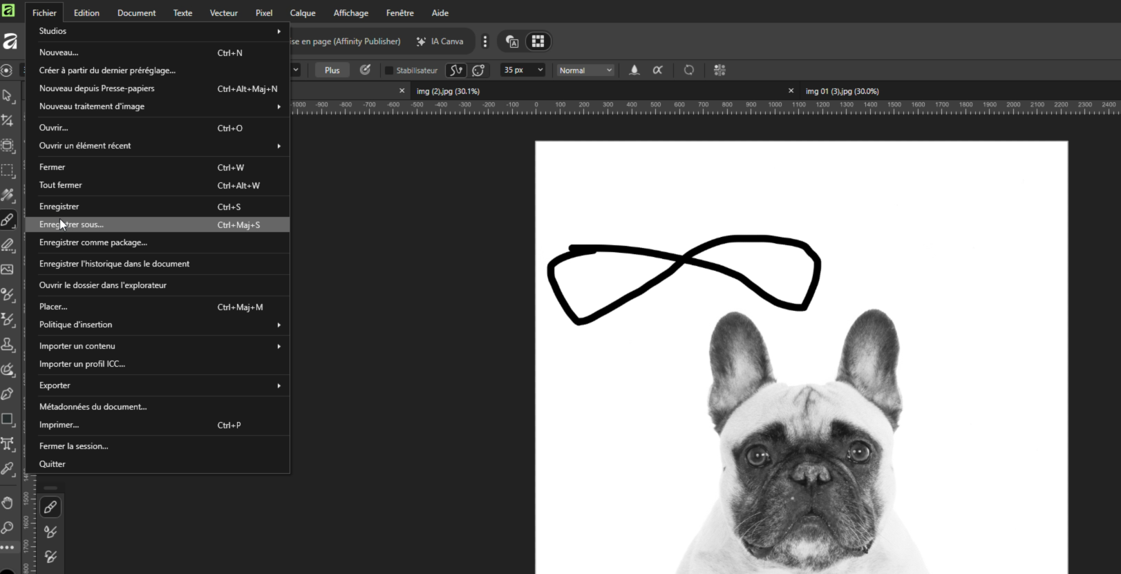 Ensuite, vous faites Fichier > Enregistrer sous, et vous enregistrez votre photo à retoucher au format AF, qui est le format natif d’Affinity. Si vous fermez l’image et que vous réouvrez le .AF, vous retrouvez tous vos calques et vous pouvez modifier votre image comme vous le souhaitez.
