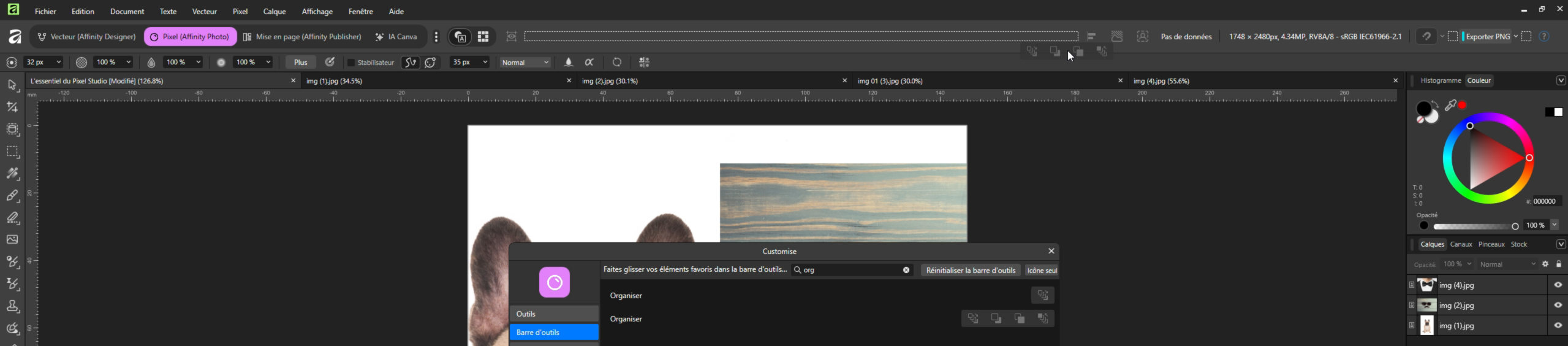 Dans cette personnalisation, vous pouvez aussi ajouter des fonctions que je considère nécessaires dans le Pixel Studio, notamment les outils d’alignement pour aligner vos photos correctement sur votre document, le mode aperçu pour voir votre composition sans règles, guides et grilles. Les outils d’organisation pour mettre en avant ou en arrière vos éléments, et les opérations booléennes si vous avez besoin d’associer des formes entre elles.