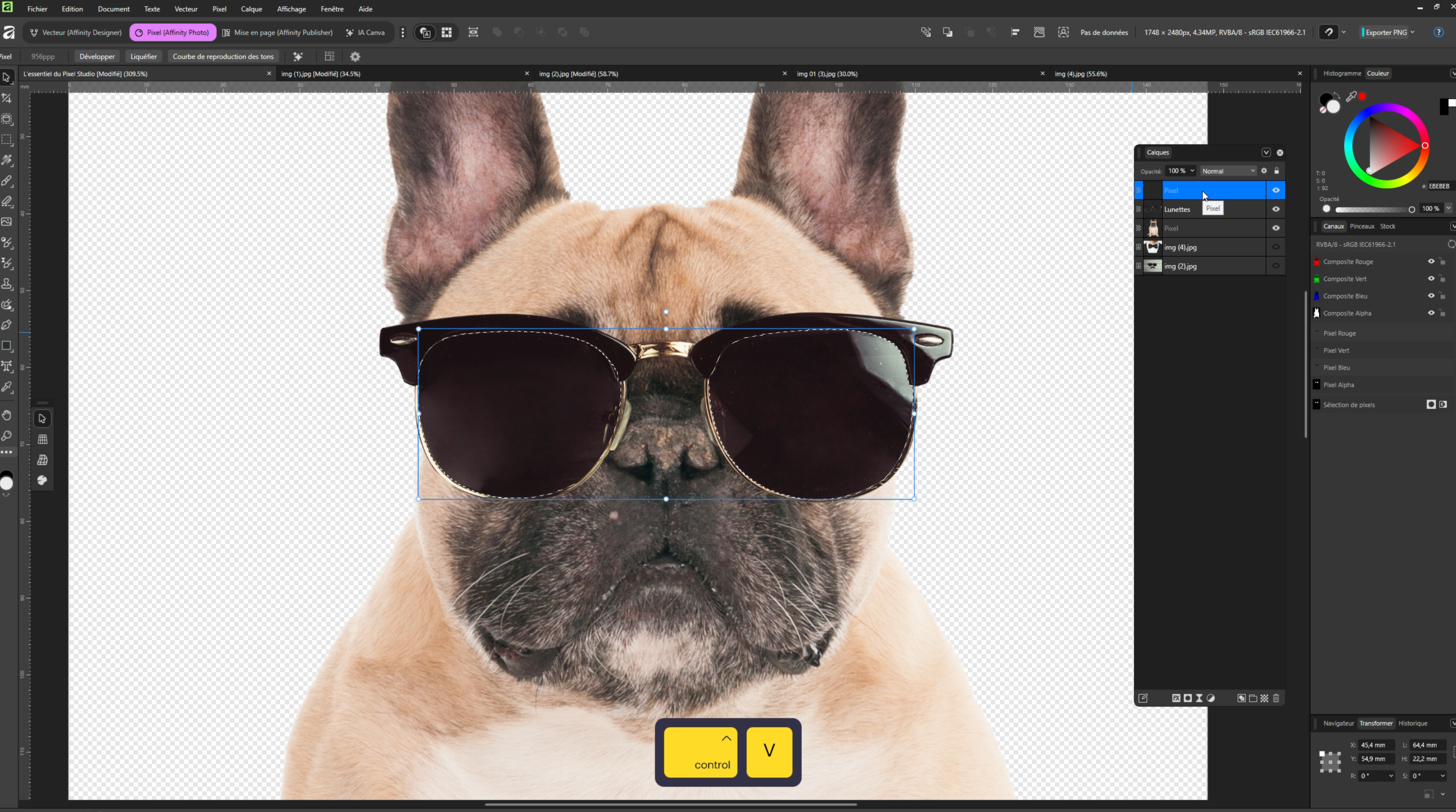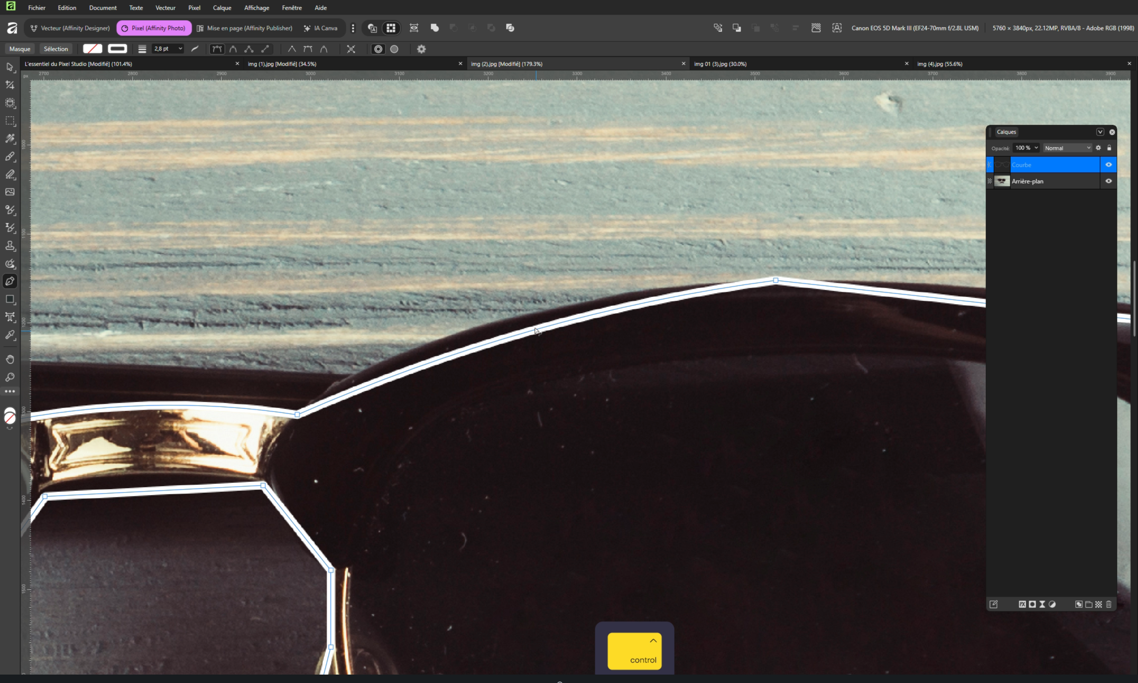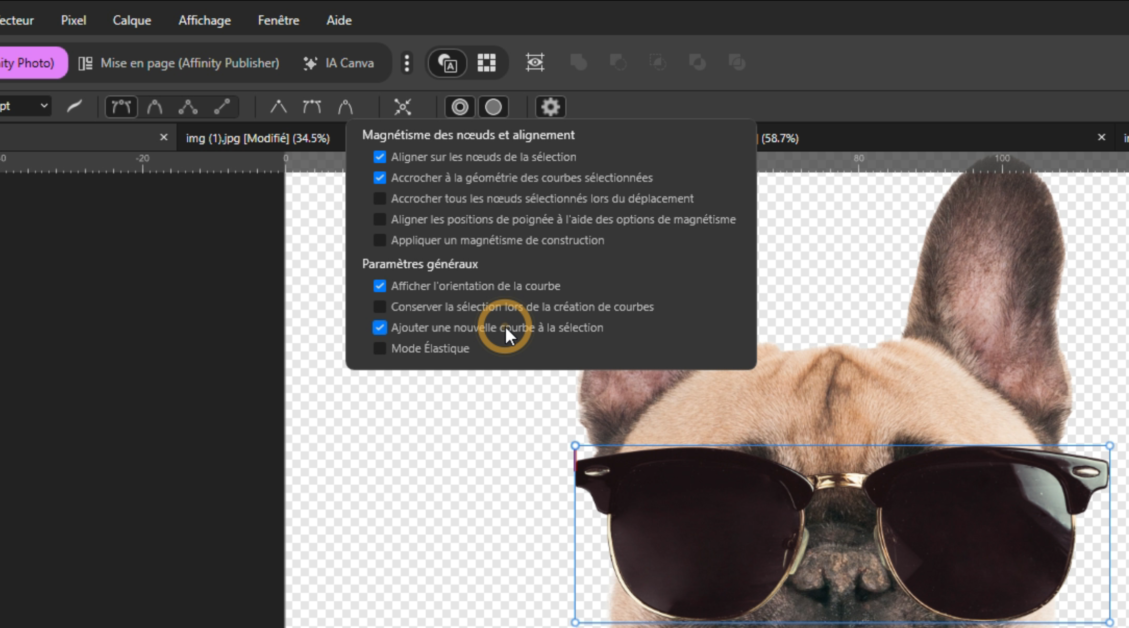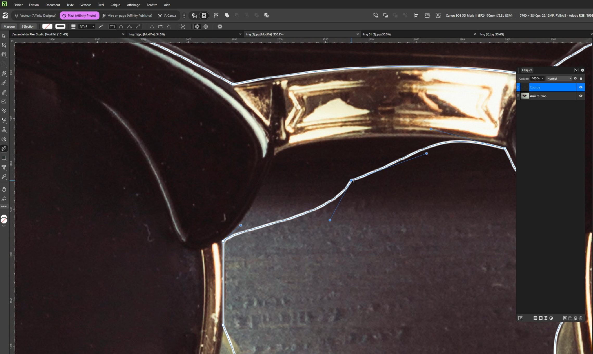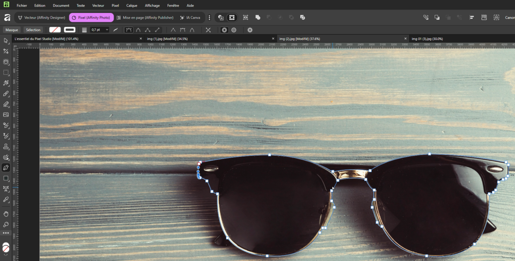 Pour des sélections très précises, l’outil plume est l’un des outils les plus importants à maîtriser dans Affinity. Il sert à tracer des formes vectorielles, mais aussi à faire des sélections ultra-précises, par exemple sur des lunettes.