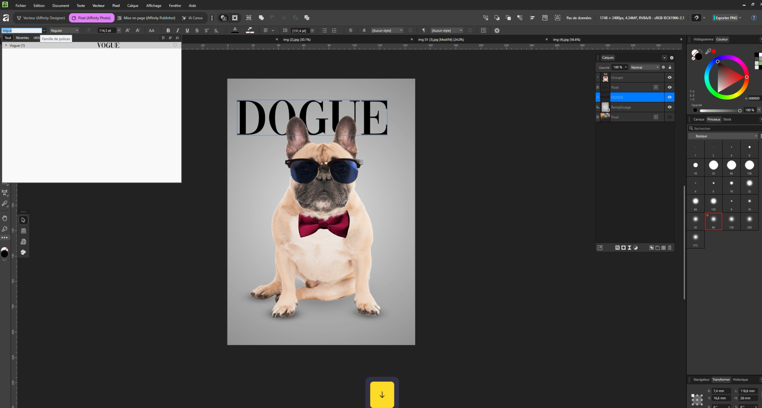 Ce petit photomontage est inspiré par coverdog et the Dog Magazine, deux comptes Instagram qui proposent ce type de couverture inspirée de Vogue. Vous pouvez ajouter un petit copyright, le placer sur le côté, et faire la rotation d’un texte avec l’outil déplacer en tournant le cadre de sélection.