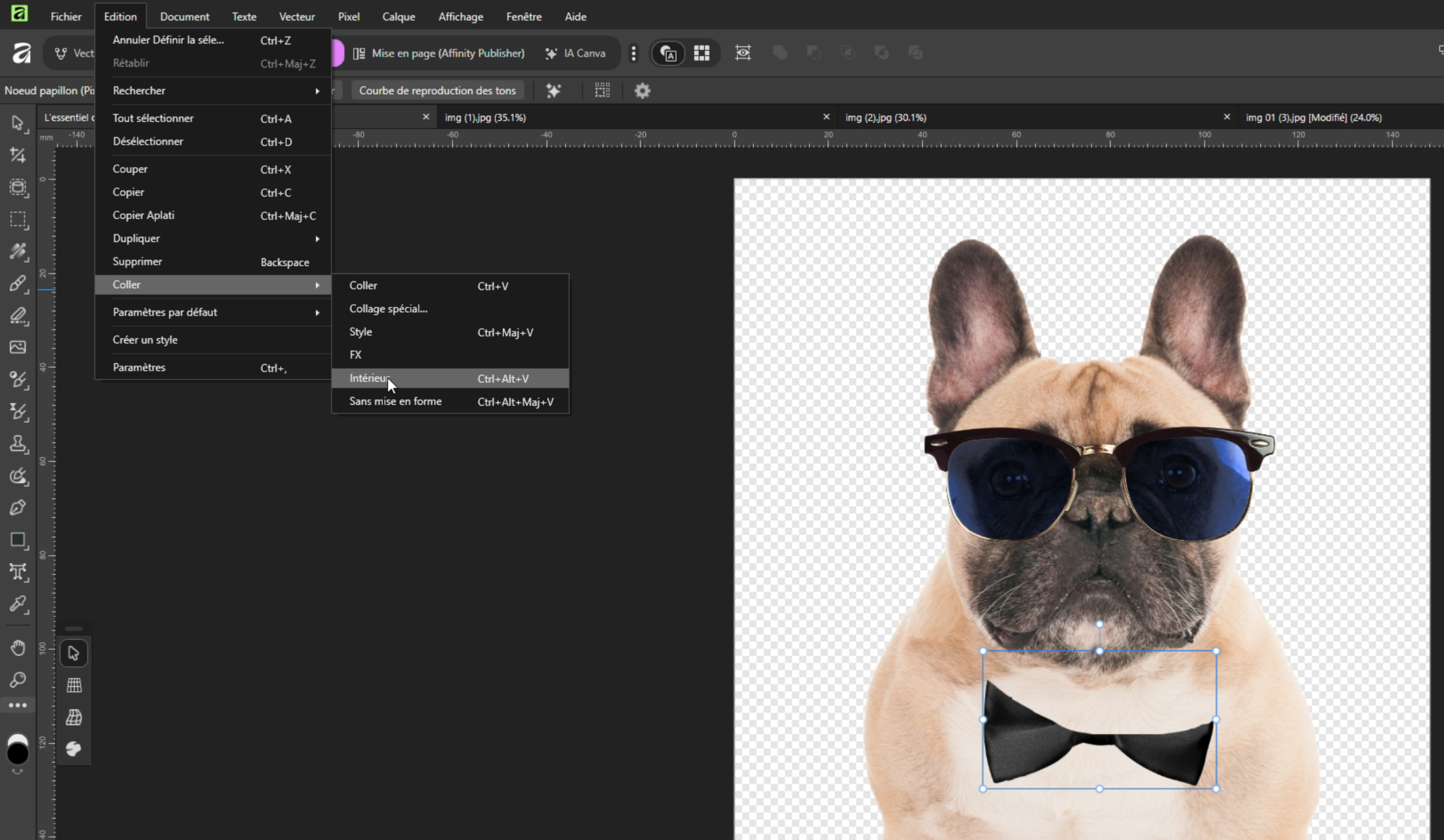 Sélectionnez le calque qui accueil le réglage (ici le nœud papillon), puis allez dans le menu Edition > Coller > Intérieur.
