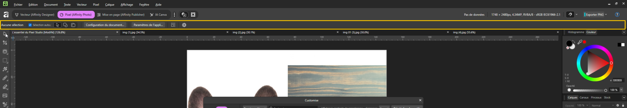 Juste au-dessus, vous avez la barre d’outils supérieure : vous y retrouvez les différents studios d’Affinity et des fonctions liées au studio en cours. Cette barre se personnalise aussi, via le menu ou avec un clic droit et “personnaliser la barre d’outils”. Vous pouvez cliquer-glisser des outils dans la barre latérale, les retirer, et même rechercher un outil, comme l’outil plume.
