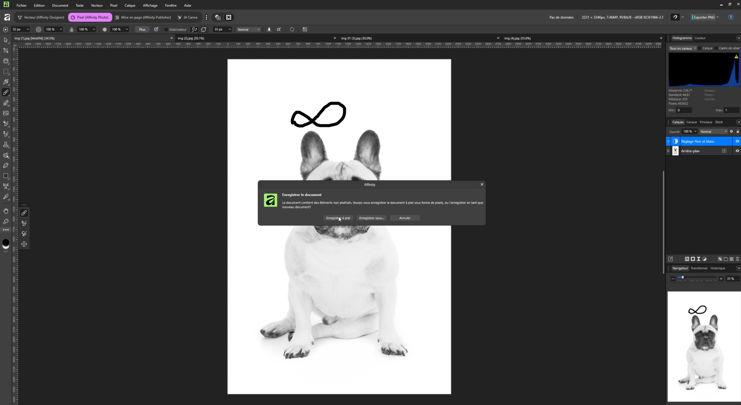 Un message apparaît en disant que vous risquez d’aplatir votre travail et d’enregistrer votre document au format d’origine, par exemple en JPEG. Le souci, c’est que vous n’allez plus pouvoir revenir dessus : quand vous allez la réouvrir dans Affinity, impossible de la modifier comme avant avec les différents claques.