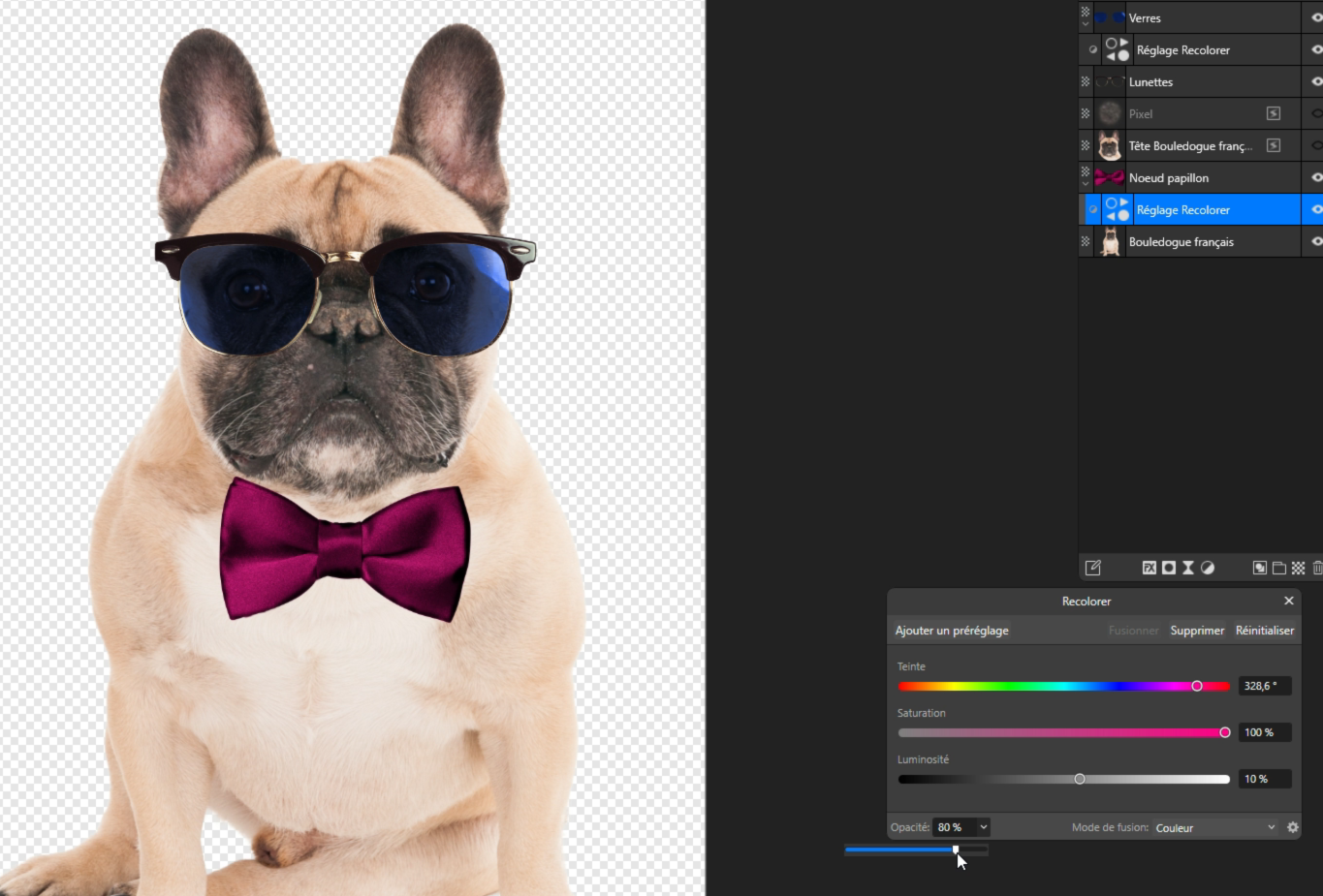 Ajustez le calque réglage en double-cliquant dessu. Puis avec un mode de fusion Couleur et une opacité à 80%, rendez l'effet plus réaliste.