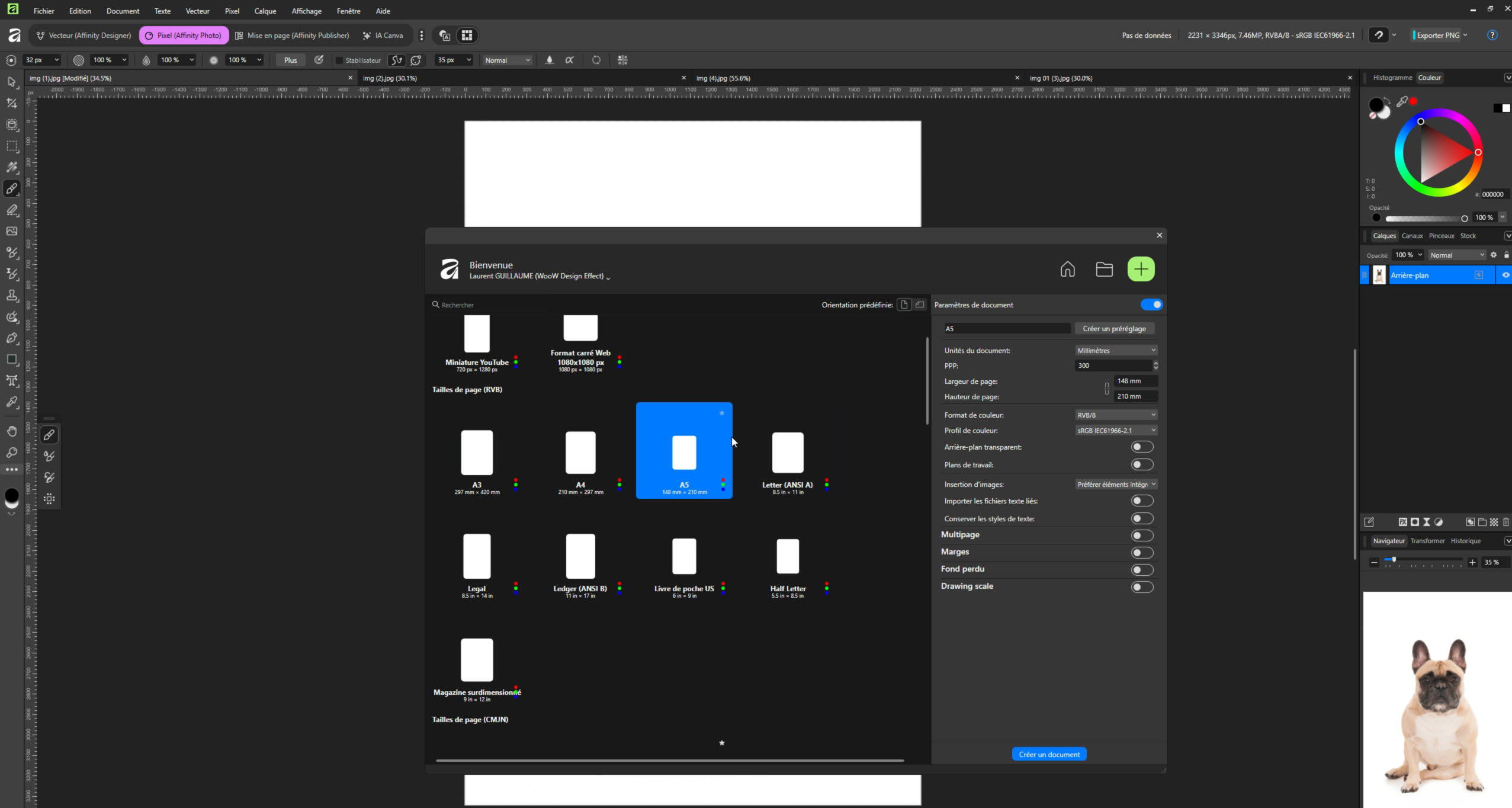 Si votre objectif est de créer une composition visuelle avec plusieurs images, je vous invite à créer un nouveau document. Vous allez dans Fichier > Nouveau, puis vous choisissez un format parmi les préréglages proposés. Vous pouvez changer les dimensions, passer à 300 pixels par point si vous faites de l’impression, changer les unités pour travailler en millimètres, et tout cela se fait assez facilement dans cette fenêtre. Pour ce tutoriel, partez sur un format A5 et cliquez sur Créer un document.