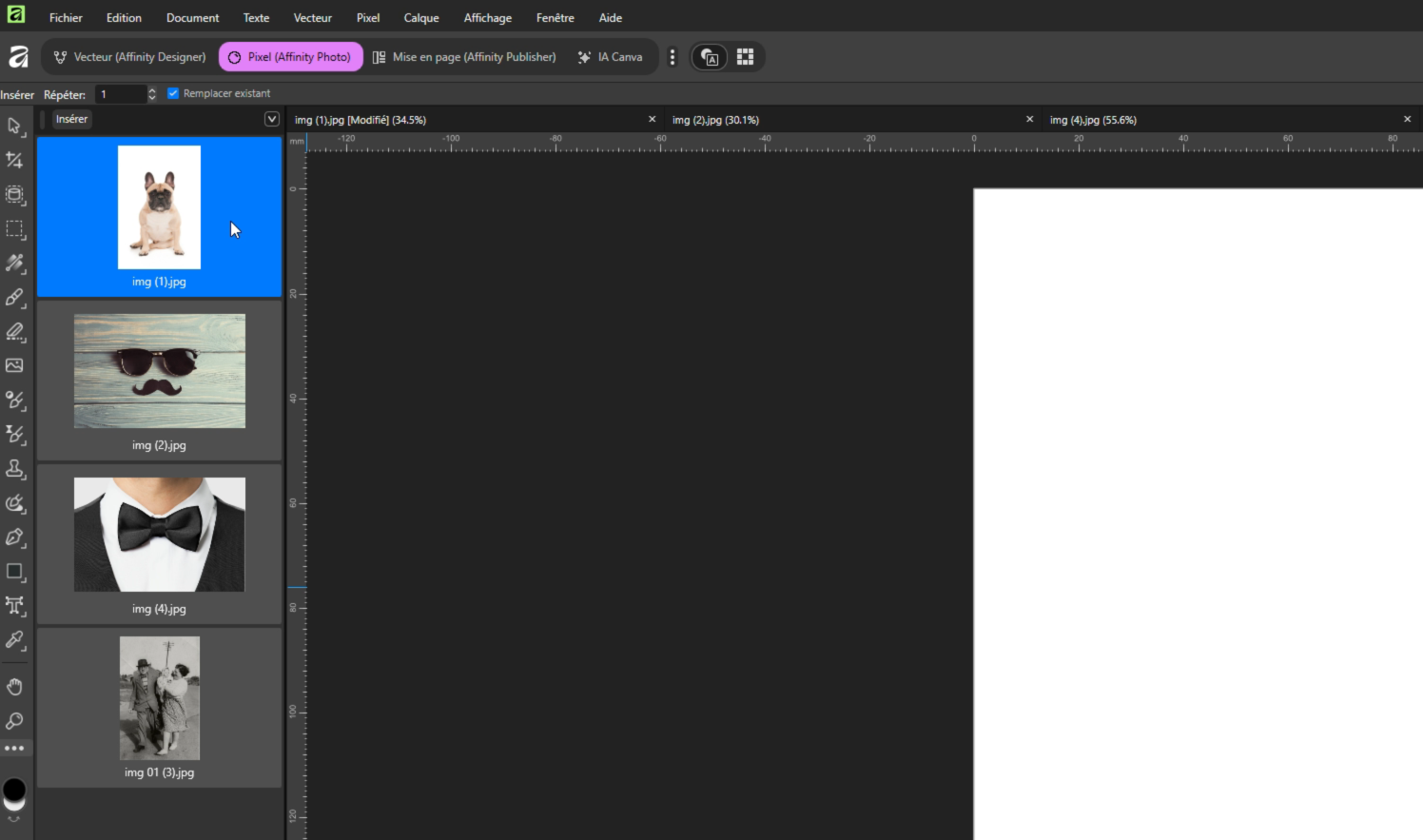 Pour commencer à retoucher une image dans Affinity, vous pouvez simplement cliquer et glisser votre image depuis votre dossier vers le logiciel. Votre image va s’ouvrir dans un onglet. Si vous choisissez d’autres images en cliquant et en glissant, elles vont toutes s’ouvrir dans différents onglets, un peu comme sur un navigateur web.