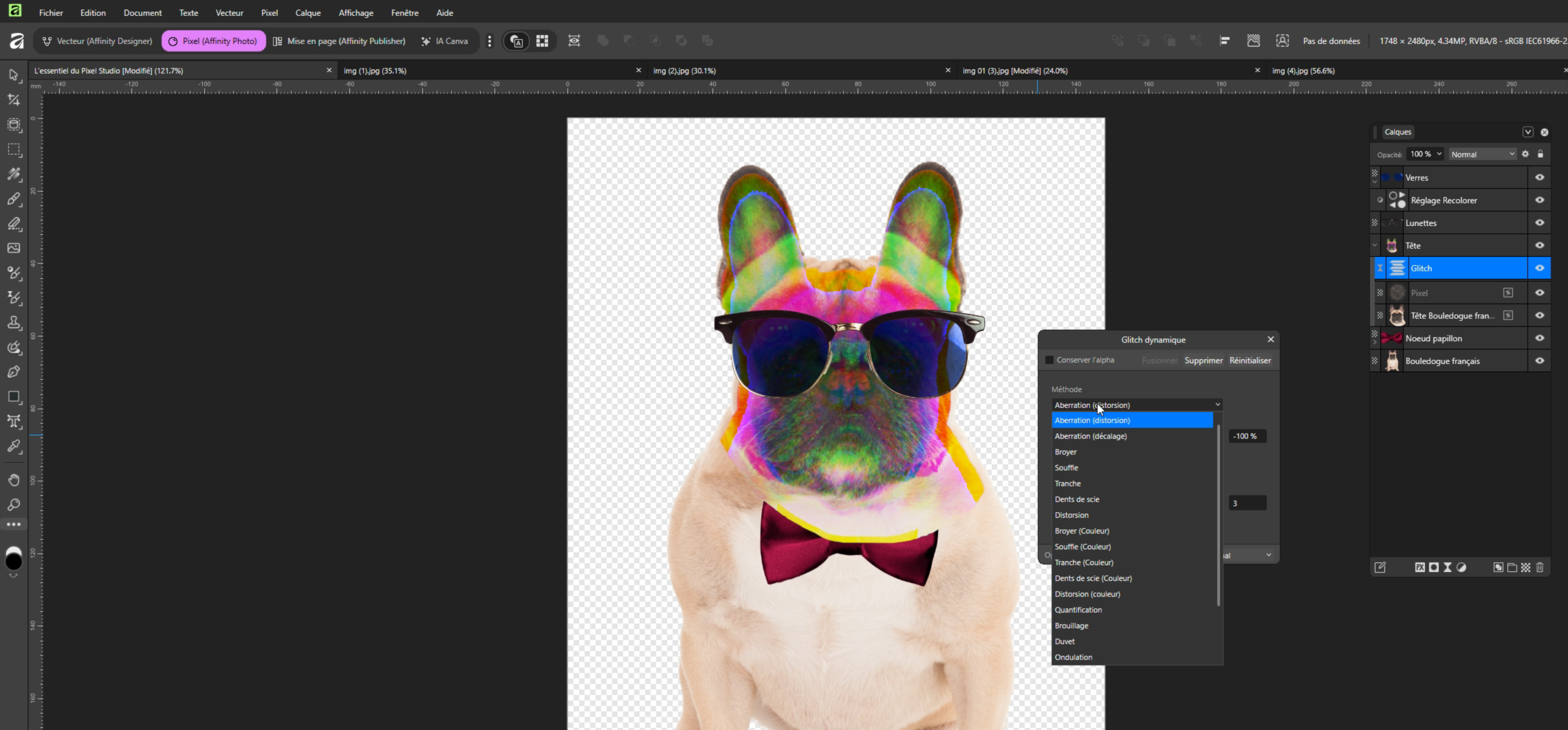 Le filtre glitch est présenté comme “le nouvel effet à la mode chez Affinity”. Il propose de nombreux réglages, comme bidirectionnel, onde, brouillage ...