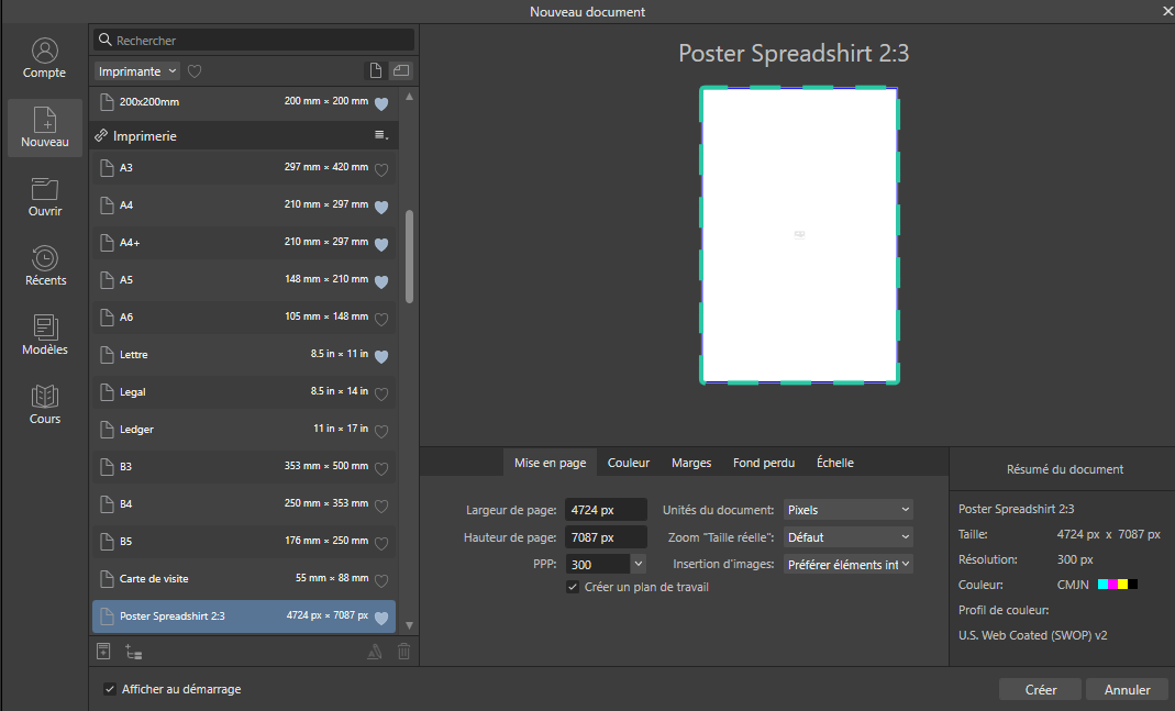 Ouvrez maintenant Affinity Designer et créez un nouveau document aux dimensions de votre choix, par exemple un format A3 (297 x 420 mm) à 300 PPP pour une impression haute qualité. Pour la plateforme Spreadshirt par exemple, il faudra créer un format spécifique de 4724 × 7087 px en 200 PPP minimum et pour l'impression, privilégiez le format de couleur CMJN. Pour les marges, c'est 2 mm minimum (ou 24 px) si vous souhaitez avoir une marge plus importante, optez pour 236,2 px (20 mm)