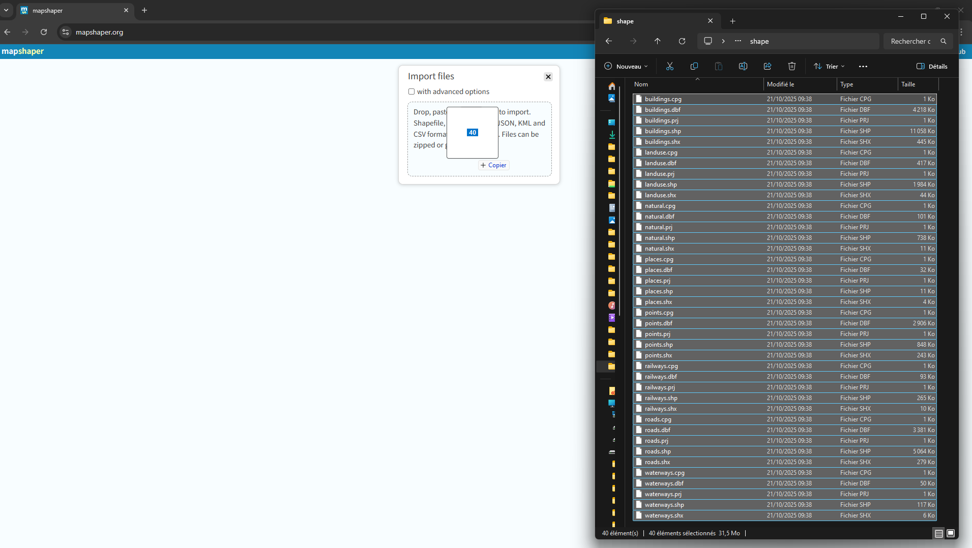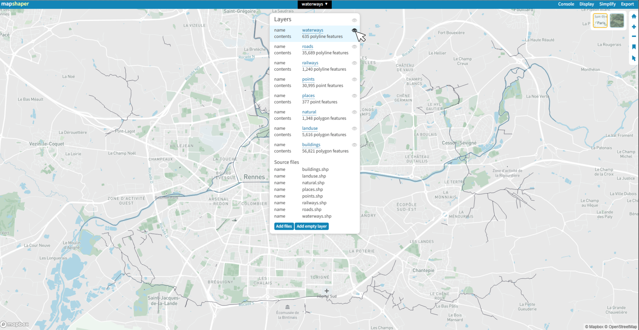 Ouvrez MapShaper et glissez les fichiers contenus dans le dossier “shapes” que vous avez téléchargé. L’interface affiche immédiatement les différentes couches : routes, rails, bâtiments, points de repère, etc.