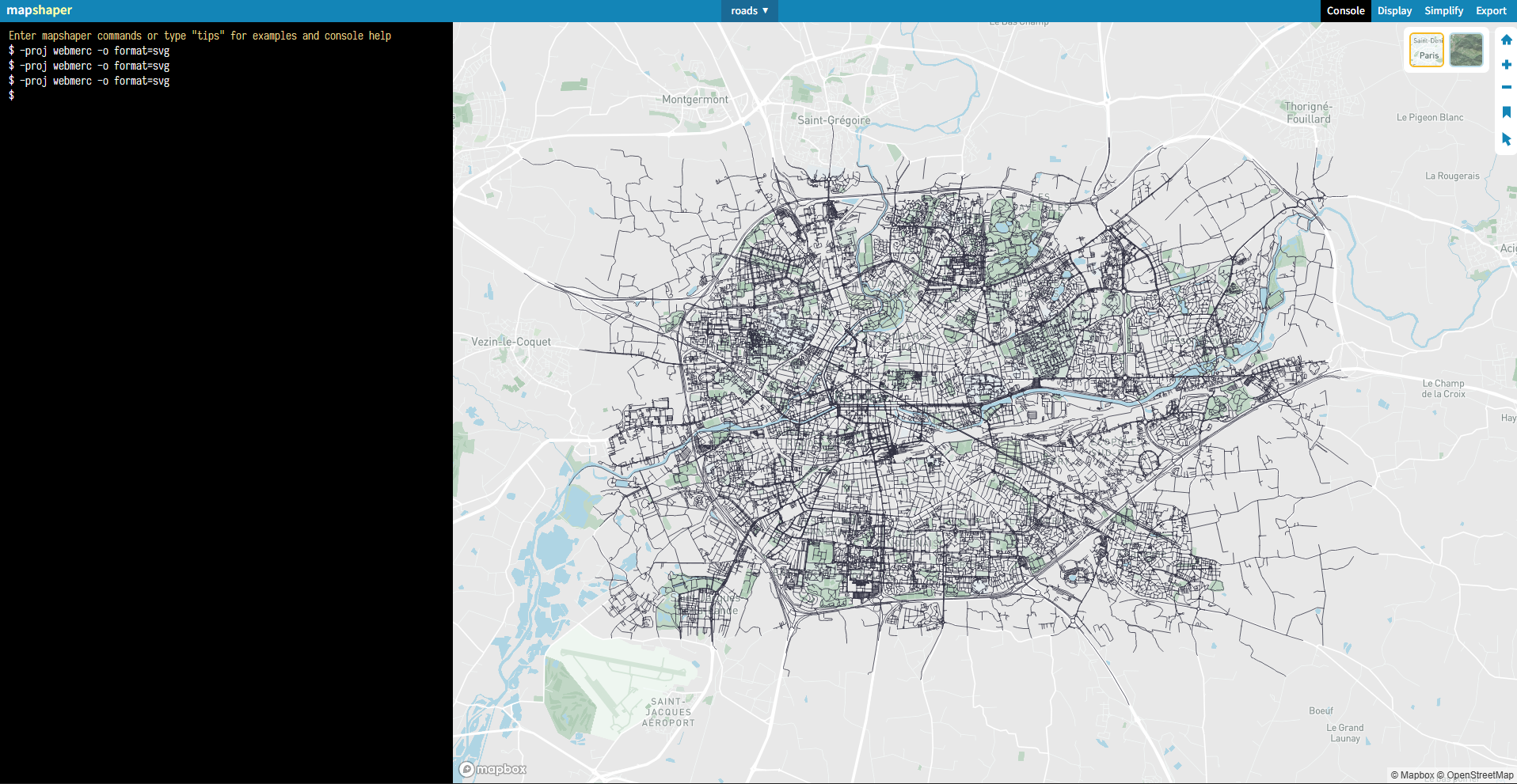 Dans la console à gauche, tapez le code suivant : -proj webmerc -o format=svg .