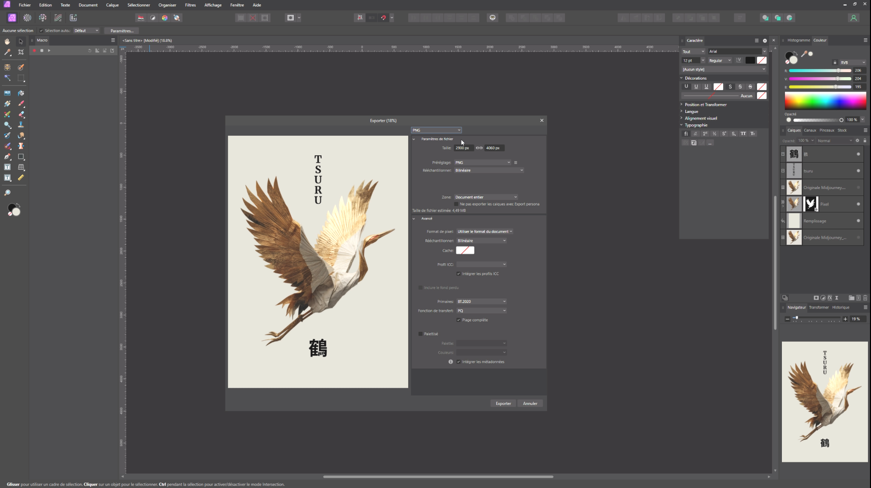 Pour enrichir la composition, on peut intégrer du texte, par exemple le nom du sujet ou sa traduction dans une autre langue. Dans notre exemple, nous avons ajouté le mot « Tsuru » (grue en japonais), accompagné de son idéogramme, placés verticalement sur la composition. L’utilisation d’une police soignée comme Merriweather Bold renforce l’aspect graphique et professionnel du visuel.