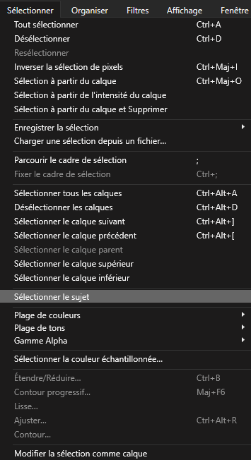 Dans notre exemple, nous travaillons sur une image de grue japonaise. Grâce à l’option « Sélectionner le sujet », qui se situe dans le menu "sélectionner", Affinity Photo détecte automatiquement la forme principale.