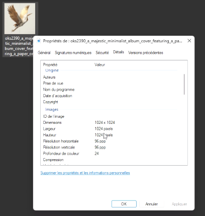 Le plus souvent, une image générée par IA mesure environ 1024 pixels de côté en 96 DPI, ce qui est insuffisant pour une impression sur Displate.