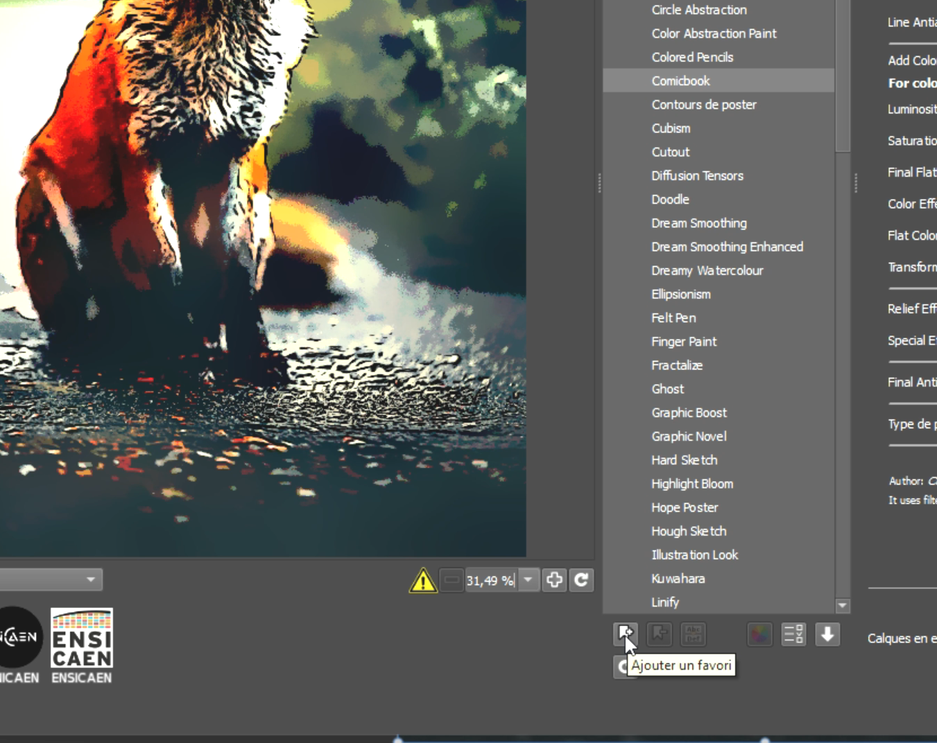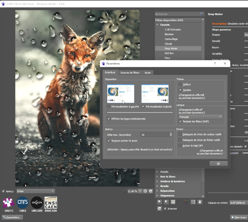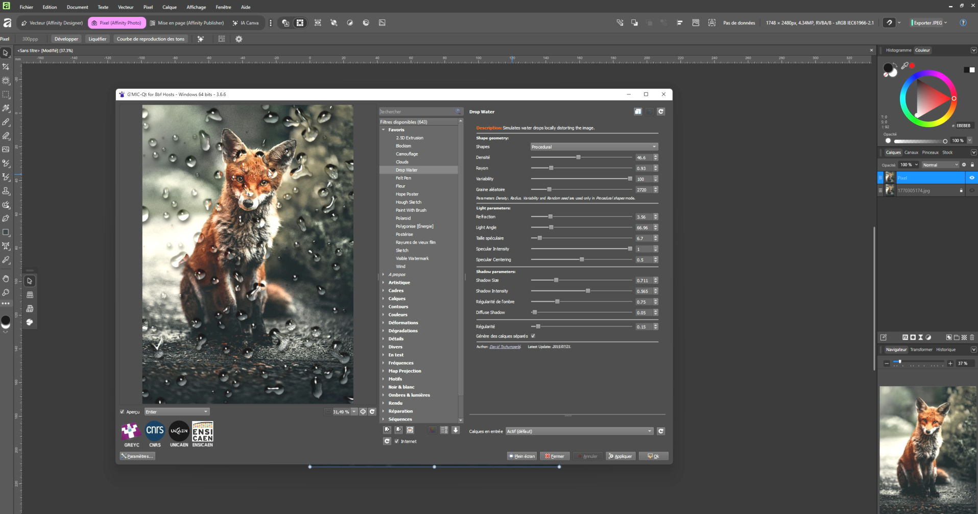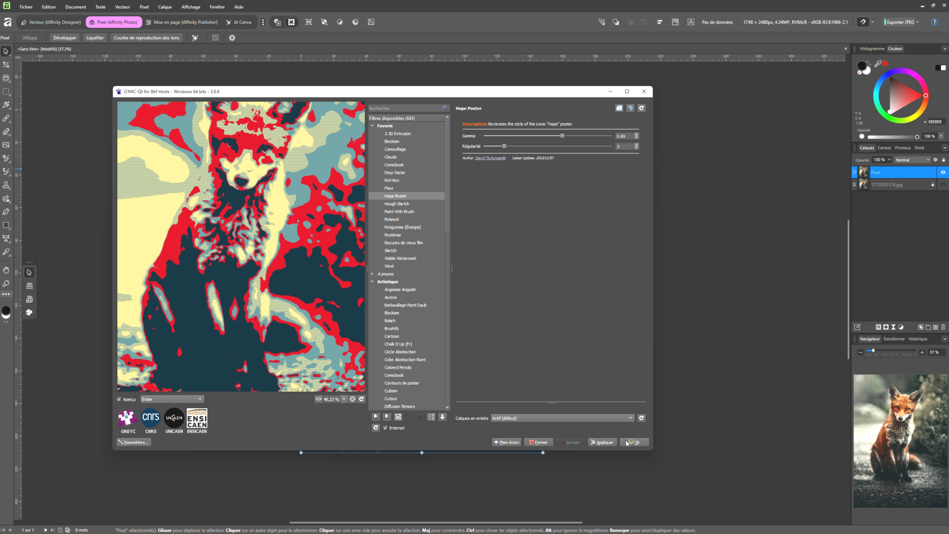 Le module dont il est question s’appelle GMIC, dans sa version 3.6. Il s’agit d’un plugin open source développé par le CRIcc en partenariat avec l’Université de Caen et le CNRS. Cocorico, c’est un projet français, enrichi par une communauté internationale, et reconnu pour la qualité et la diversité de ses filtres.