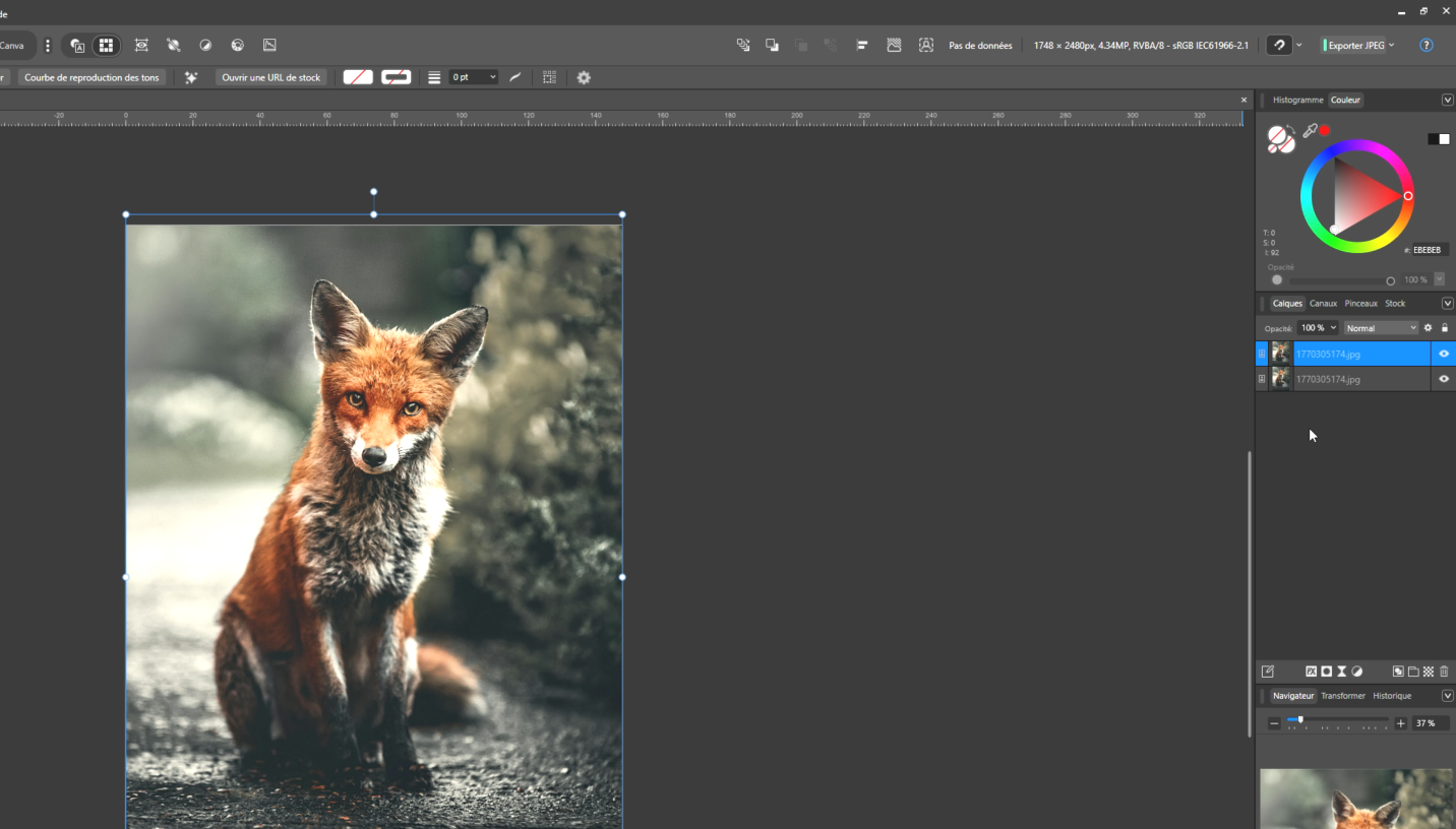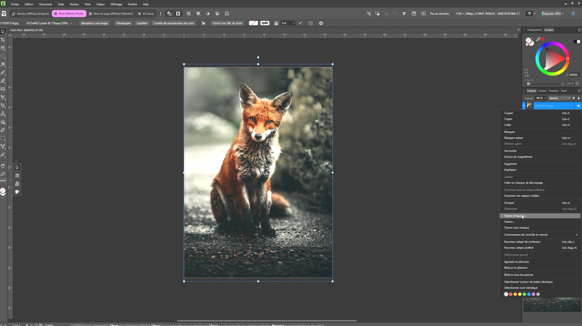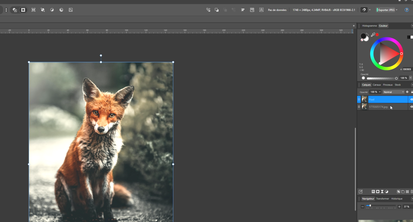 Pour vos tests, vous pouvez utiliser une image issue du stock intégré à Affinity, provenant des bibliothèques Pixel ou Pixabay. Une simple recherche permet de trouver rapidement une image adaptée à vos essais.