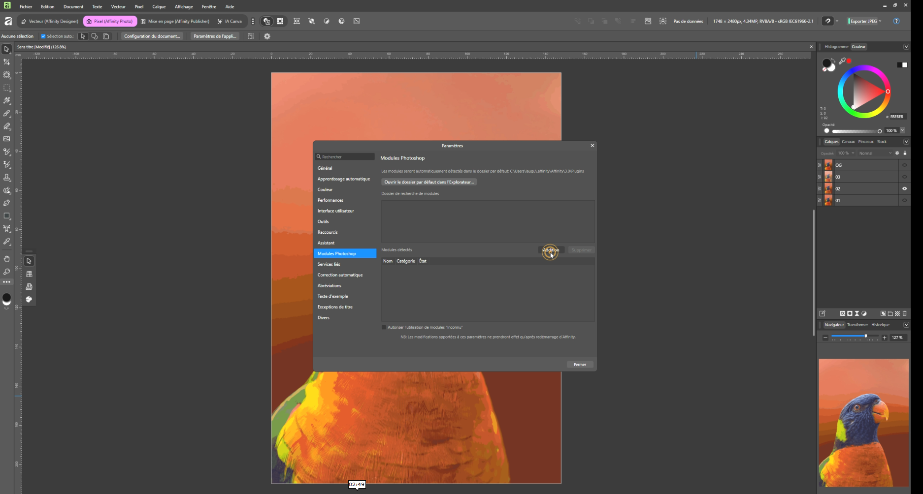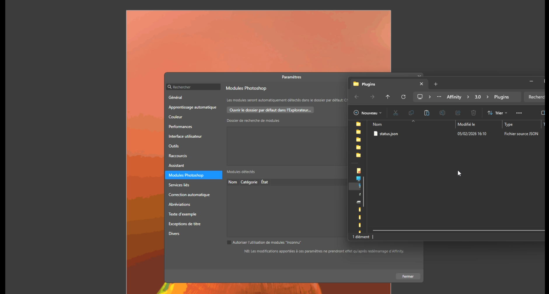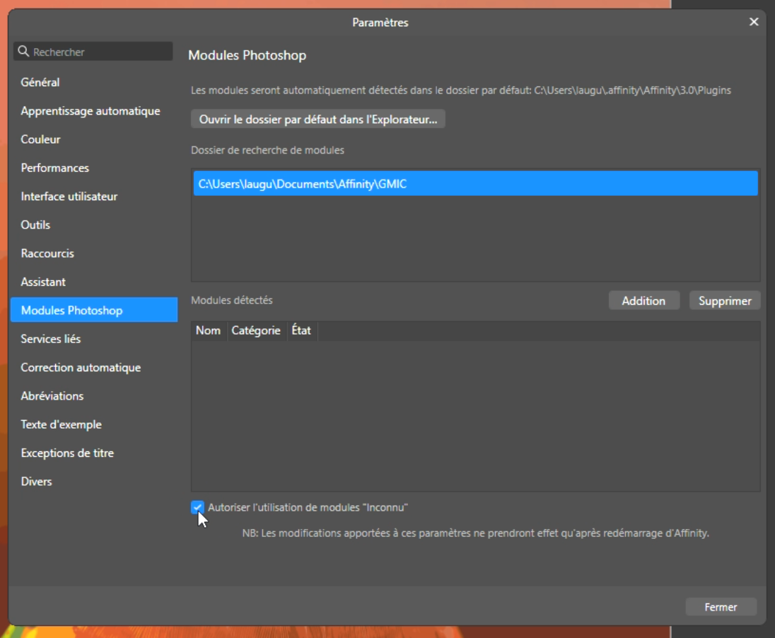 Dernière étape indispensable, vous devez autoriser l’utilisation de modules inconnus. Sans cette option activée, le plugin ne sera pas détecté par le logiciel. Une fois cette option cochée, vous fermez la fenêtre des paramètres. Affinity vous demande alors de redémarrer le logiciel afin d’appliquer les changements.