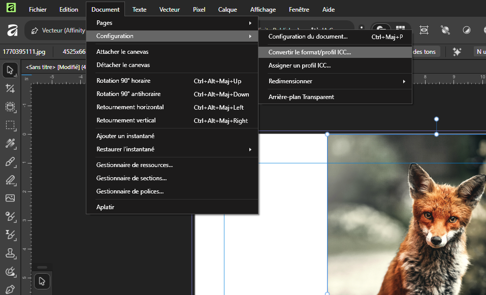 Si votre document est en cmjn, allez dans le menu Document, puis Configuration et cliquez sur Convertir le format/profil ICC...