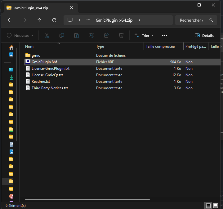 Après avoir cliqué sur le lien correspondant au plugin GMIC pour Windows, vous téléchargez un fichier compressé au format ZIP.