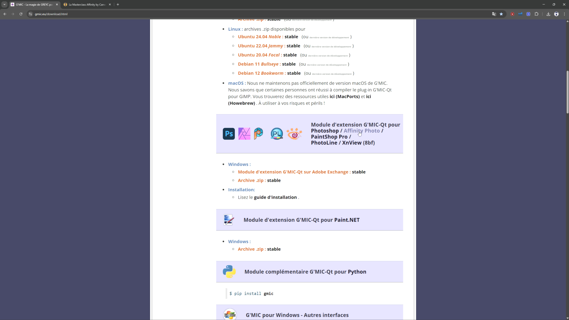 Si vous ne connaissez pas encore GMIC, ou si vous l’aviez installé il y a plusieurs années sur Affinity Photo, la première étape consiste à vous rendre sur la page de téléchargement du module.