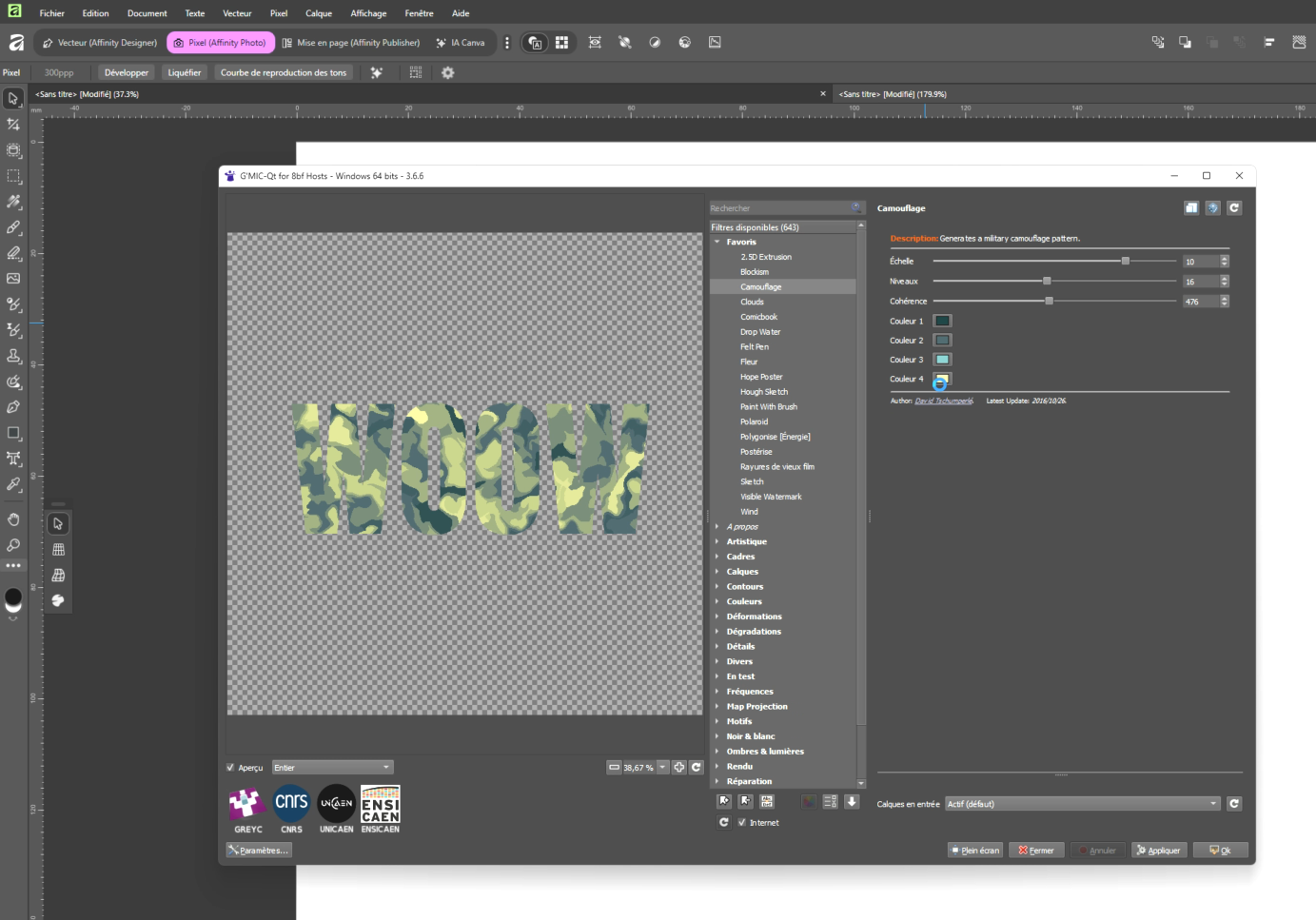 GMIC est un module complémentaire puissant, gratuit et open source, développé par des équipes françaises et li est extrêmement riche en possibilités. Il permet d’aller très loin dans la création d’effets visuels directement dans Affinity by Canva.