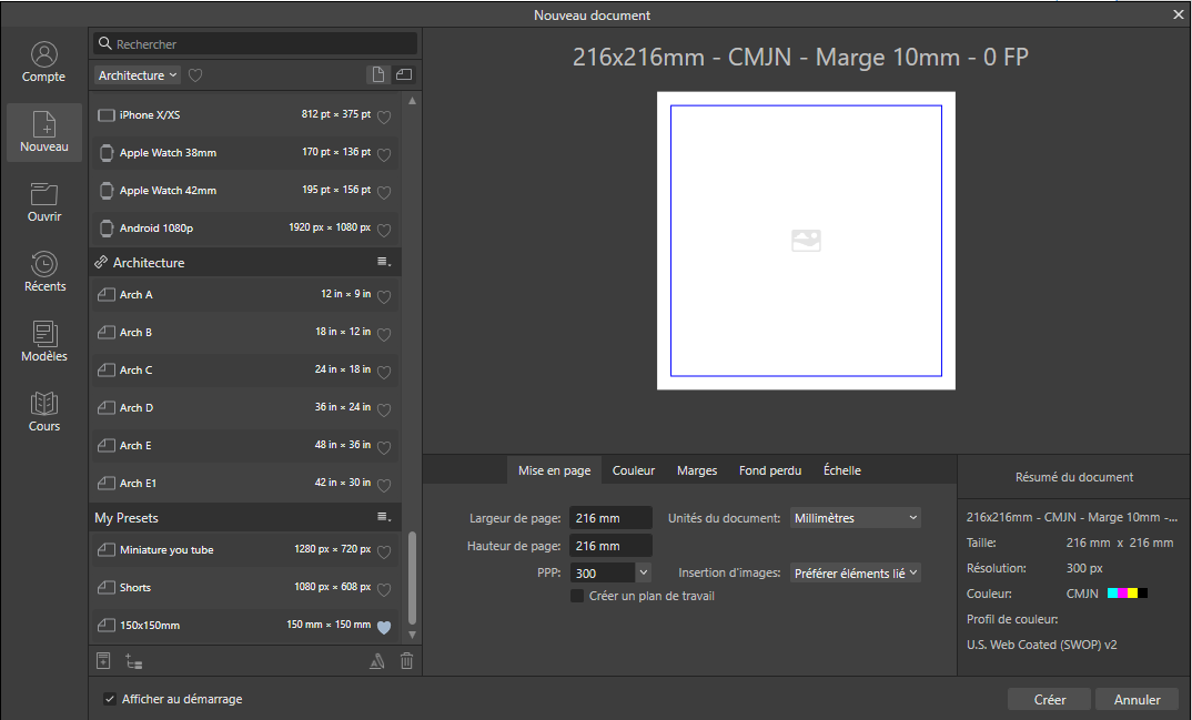 Ici j'utilise un format bien connu par les adeptes des cahiers de coloriages sur Amazon KDP. Format carré 216×216 mm en 300 PPP, Format de couleur CMJN, Marge 10 mm de tous les côtés et pas de fond perdu.