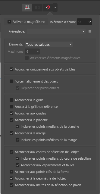 👉 Astuce : Activez le magnétisme (Barre d'outil supérieure → Magnétisme, c'est l'icône en forme d'aimant rouge) pour que vos lignes s’alignent parfaitement sur les précédentes. Cochez “accrocher au guide”, “accrocher à la planche”, “inclure les points médians” et “accrocher à la marge”.