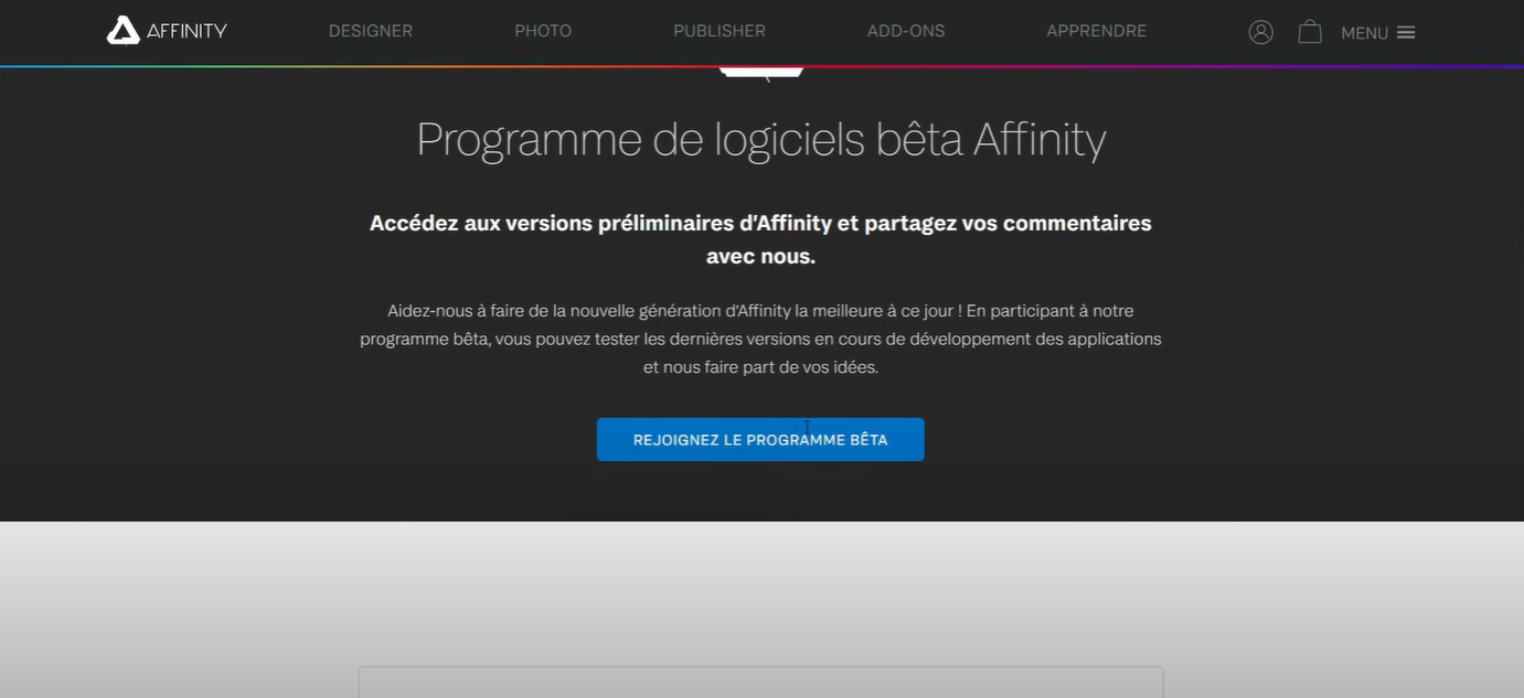 Pour essayer la version bêta, inscrivez-vous directement avec votre compte Serif sur https://affinity.serif.com/fr/affinity-beta-program/