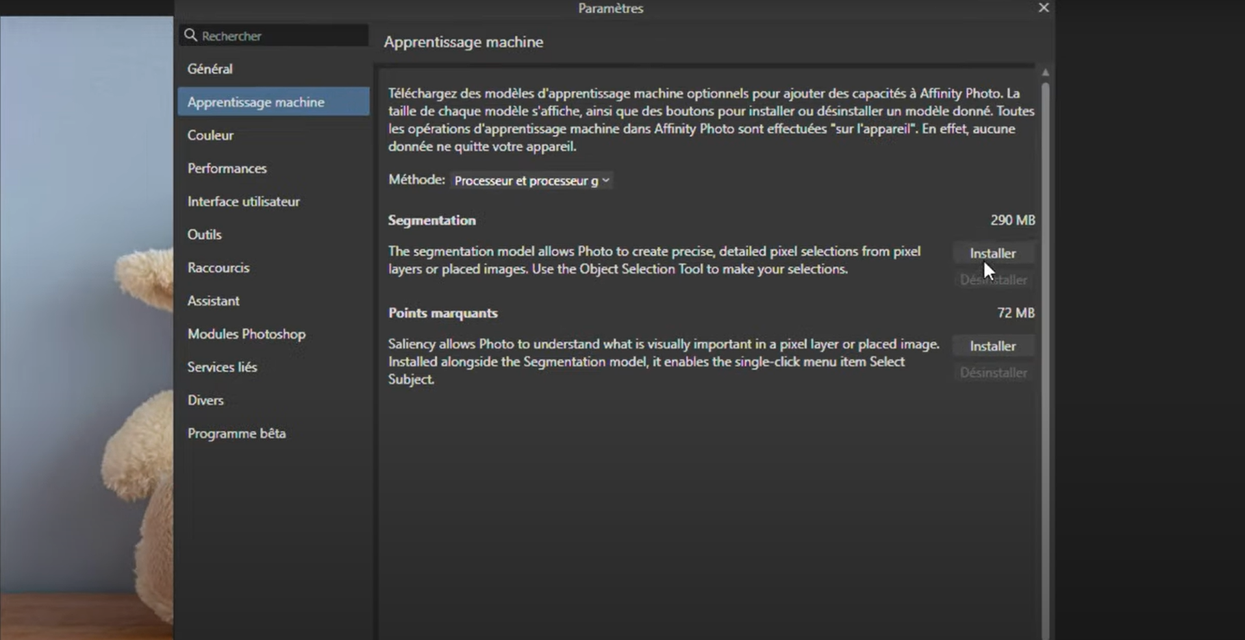 Installation du Modèle d'Apprentissage (IA dans Affinity Photo)