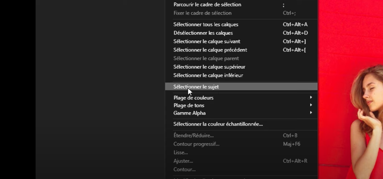 Utiliser la Fonction : Allez dans "Sélectionner" et choisissez "Sélectionner le sujet". La machine travaille automatiquement pour détecter le sujet.