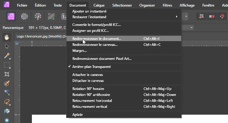 Changer la taille du document : Accédez aux paramètres de taille de l'image via le menu "Document" - "Redimensionner le document".